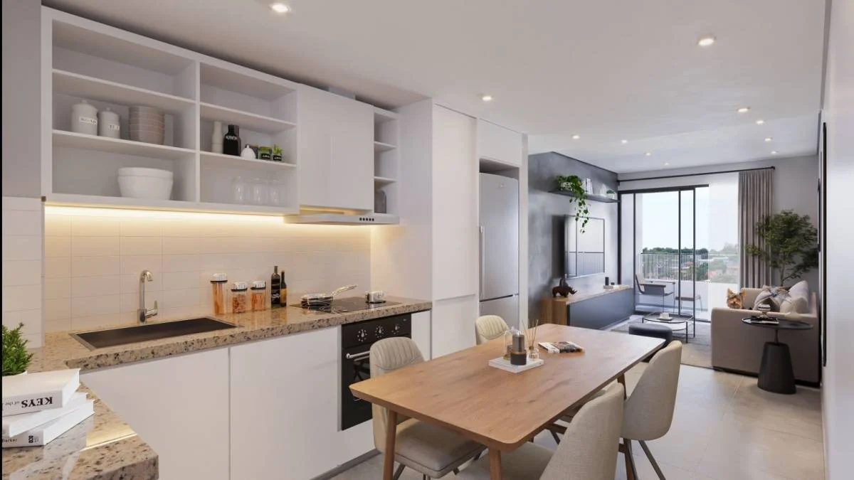 44 departamentos, entre ellos monoambientes, de 1, 2 y 3 dormitorios. 46 cocheras en planta baja y sub suelo con accesos independientes.