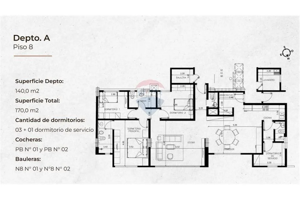Este magnífico departamento, situado en el piso 8 (unidad A), ofrece una generosa superficie de 140 m² útiles y 172.8 m² de superficie propia, diseñado para quienes buscan amplitud y sofisticación. Disfrute de una distribución inteligente que incluye: