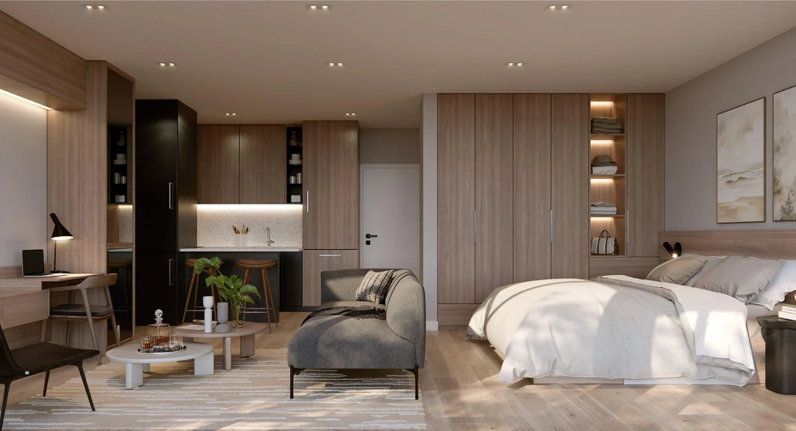Todas las unidades equipadas con muebles de cocina, anafe, horno empotrado extractor, microondas, placares en las habitaciones, baños completos, a.a. en todos los ambientes, cerraduras tipo Smart Lock.