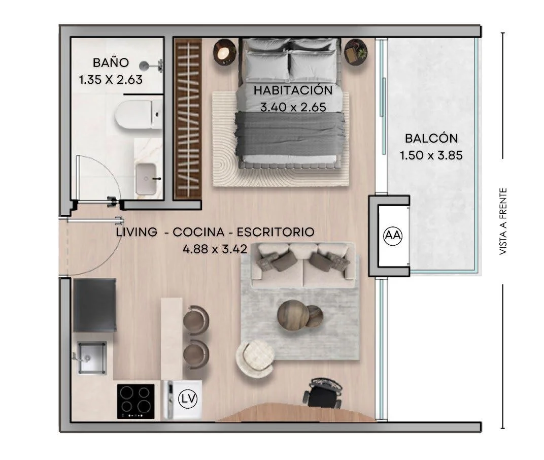 ✔ Tipologías líquidas (monoambientes y 1 dormitorio)