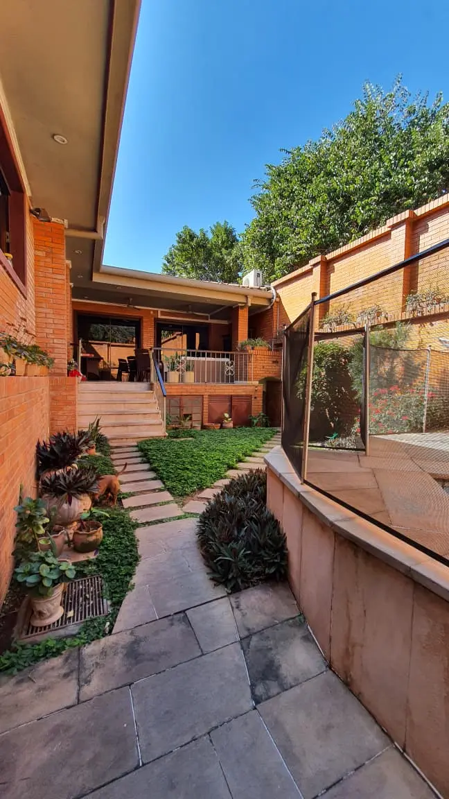 Jardín posterior con quincho cerrado, baño y piscina