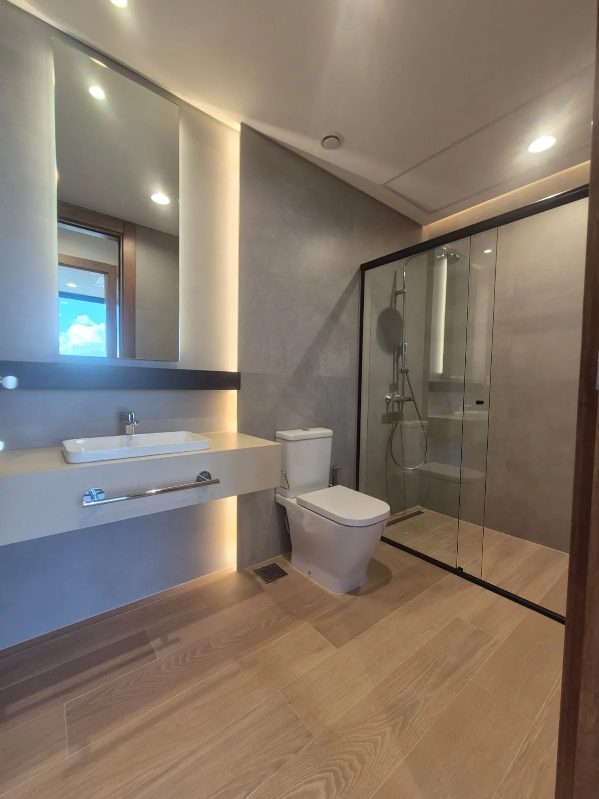 . Baño con espejo e iluminación difusa,