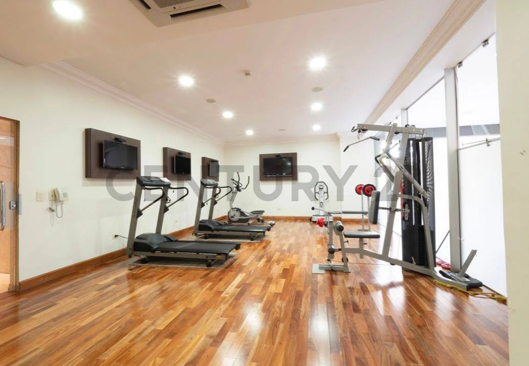 Amplio y cómodo departamento ubicado estratégicamente sobre la Avenida Santa Teresa, a pasos del Paseo Galería. El departamento cuenta con tres habitaciones en suite, sala-comedor social, baño social, amplio balcón con parrilla y fabulosas vistas al contrafrente con una orientación óptima. Cuenta además con una amplia cocina, área de servicio y habitación de servicio independiente con baño. El departamento se encuentra climatizado con aires tipo cassette, y cuenta con pisos de parquet de primerísima calidad. Posee conexión con un generador que abastece al 100 por ciento del departamento, el agua se provee de un pozo artesiano con lo cual la provisión de la misma se encuentra garantizada en todo momento. El departamento incluye dos unidades de cochera bajo techo y una baulera. El edificio cuenta con servicio de guardia 24 horas, circuito cerrado, y un lobby finamente decorado. Los amenities conforman un amplio gimnasio con equipamiento completo, salón de fiestas con cocina de apoyo, sala de juegos climatizada para niños, sala de cine, piscina y quincho.