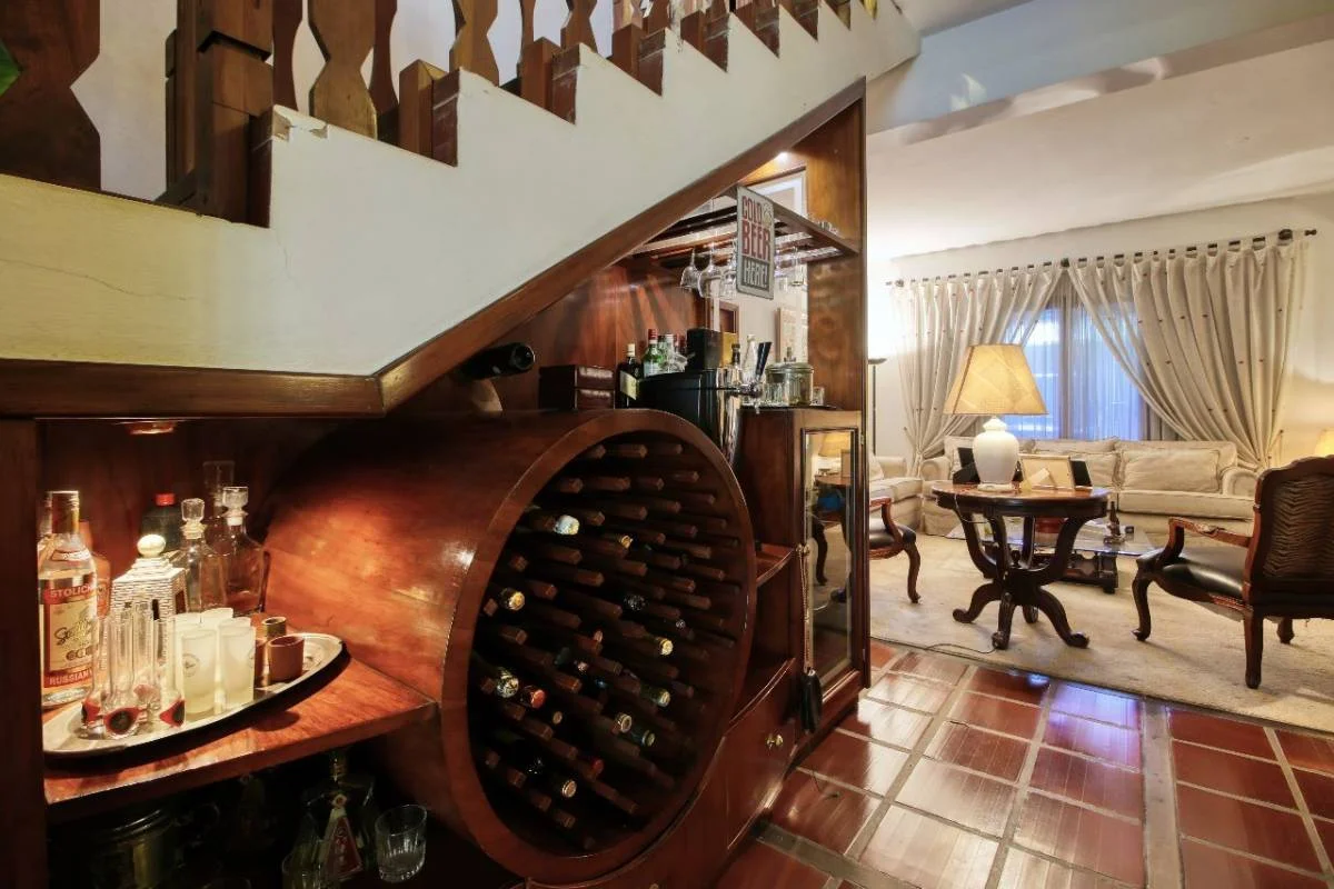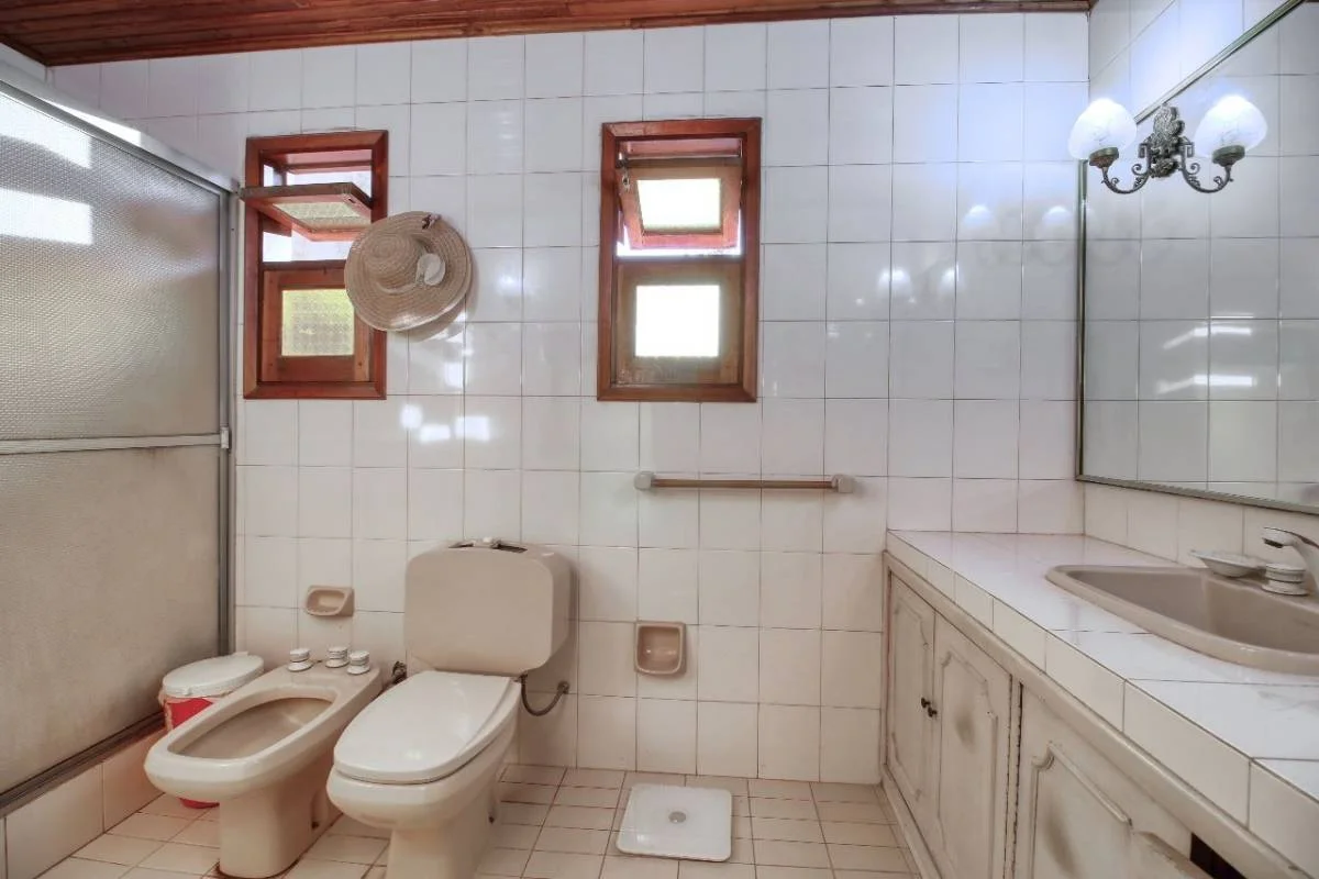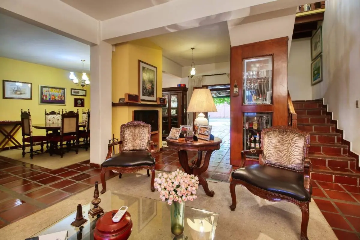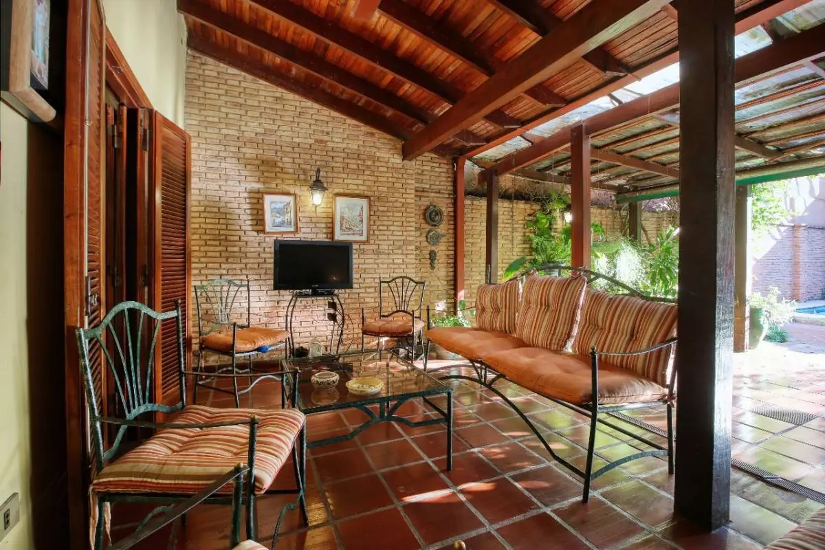 Sala con chimenea doble, comedor, cocina independiente, baño social, quincho con parrilla, patio empastado, piscina, lavadero, depósito.