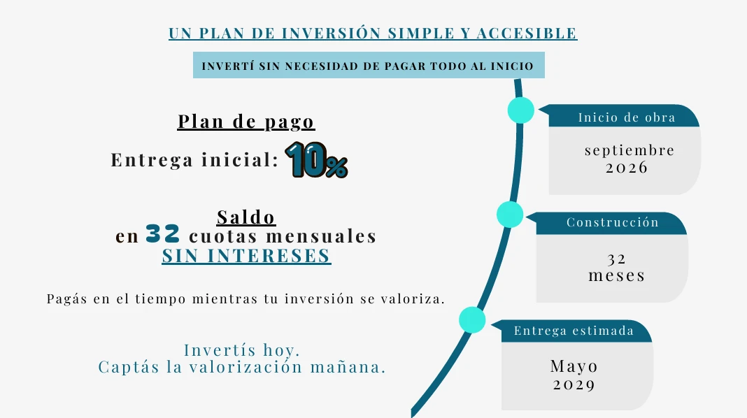 El saldo de USD 37.350 lo pagás en 32 cuotas mensuales SIN INTERESES durante la construcción. Precio total: USD 41.500.