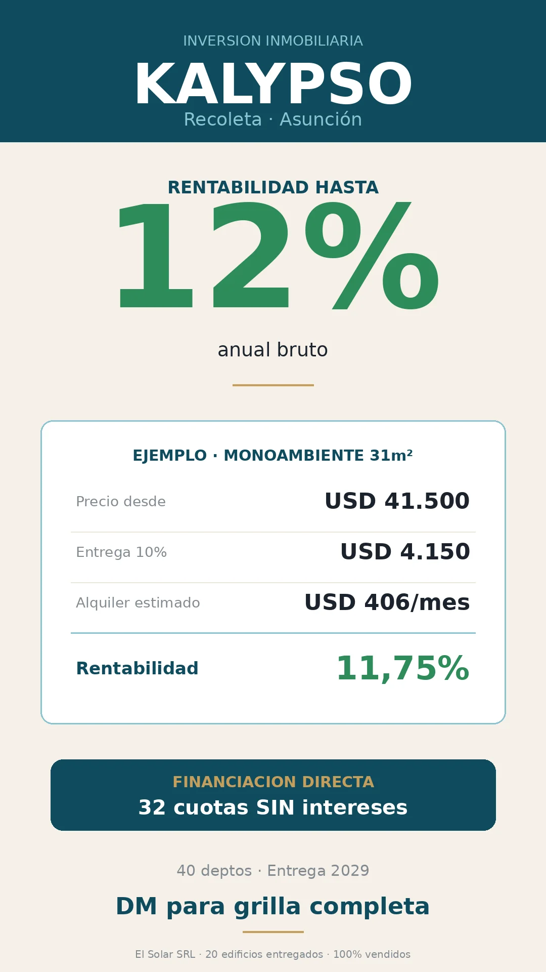 Desarrollador de confianza — El Solar SRL: 20 edificios entregados (3 en Paraguay, 17 en Francia), 338 departamentos, +52.000 m² construidos. 100% vendidos en todos sus proyectos anteriores.
