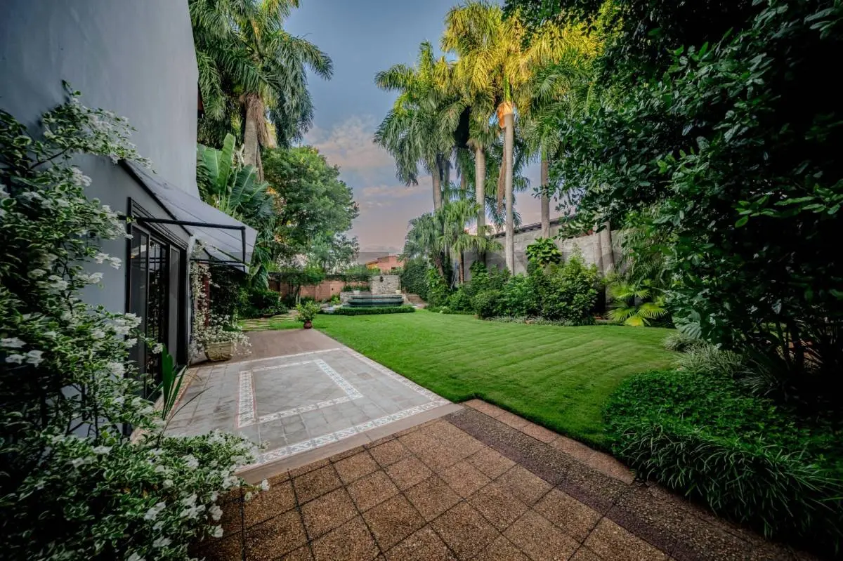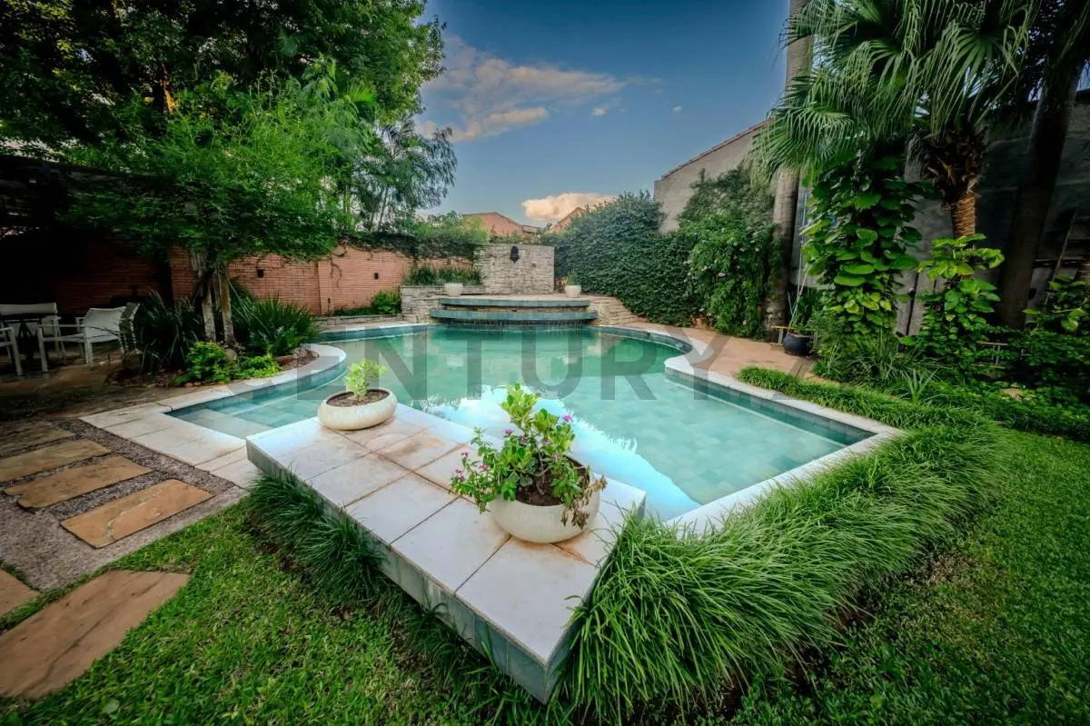 Jardín Exclusivo: Patio de generosas dimensiones con palmeras añosas y piscina de gran tamaño con cascada, creando un entorno natural y relajante.