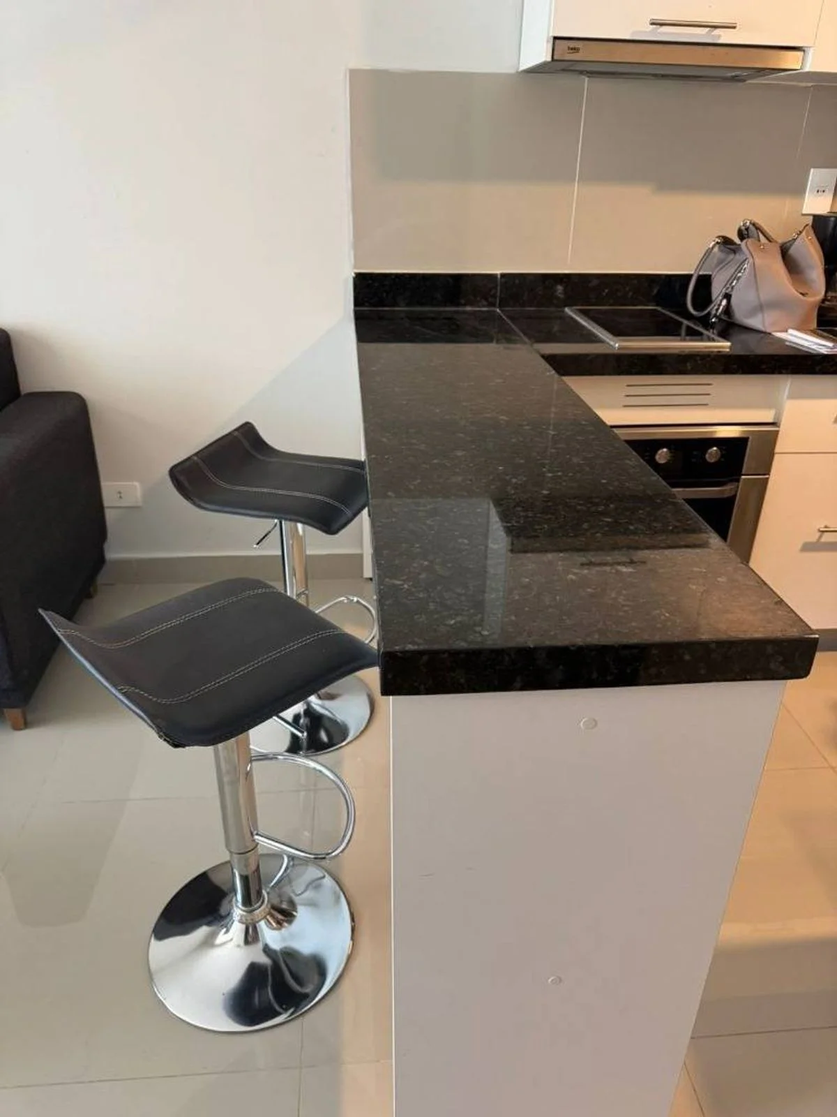 Cocina amoblada, equipada con anafe, extractor y horno empotrado.
