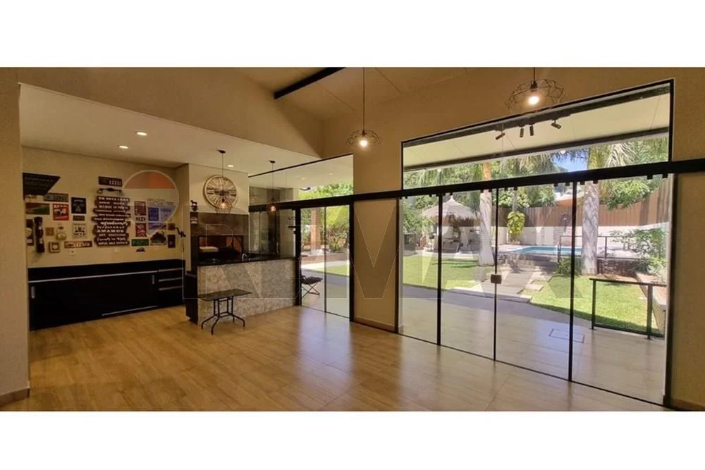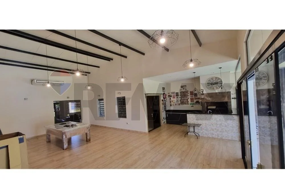 Quincho y salón multiuso con climatización, baño independiente, parrilla, mesadas de granito, lavatorio y armarios; ideal para recibir a más de 30 personas, con vista al patio y piscina de 30.000 litros.