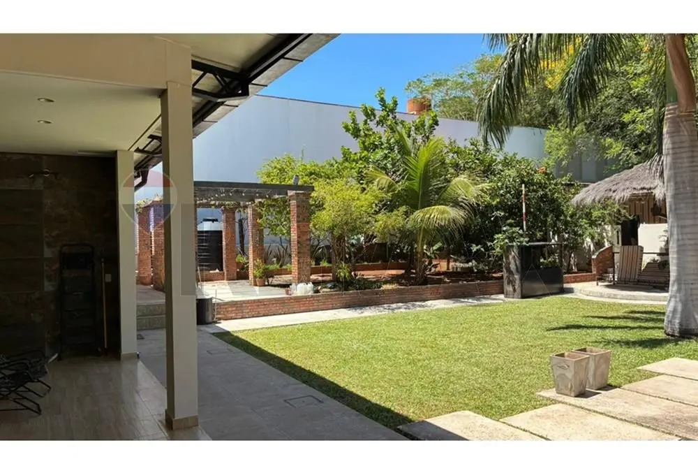 Amplio patio trasero, galería, parralera con piso, jardín con césped, palmeras y árboles frutales.
