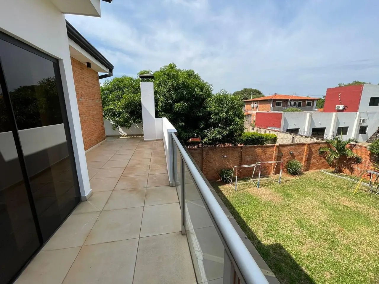 Amplio patio empastado.