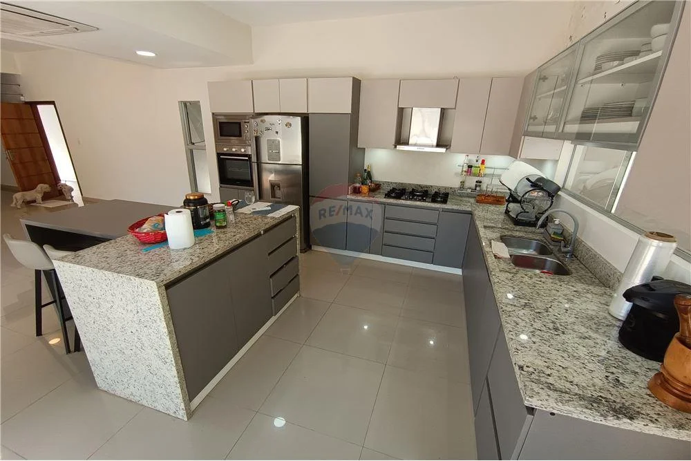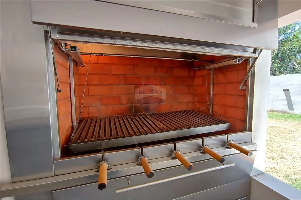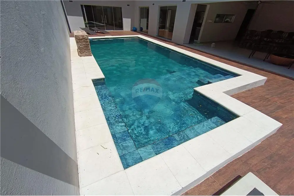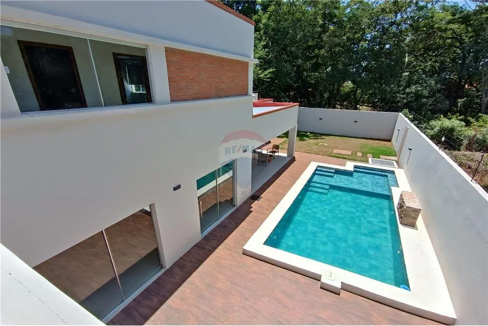 Cochera al frente, acceso principal, amplia sala, baño social, cocina comedor, quincho con una parrilla de acero inoxidable y mesada, piscina, patio empastado, baño para área de piscina, acceso independiente de servicio, deposito/dormitorio servicio, lavadero.