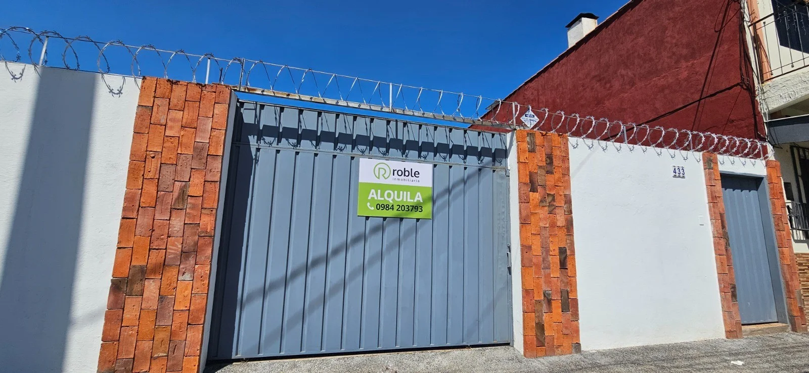 Edificio con cerco perimetral y CCTV, portón basculante y baño de servicio en sector de cochera.