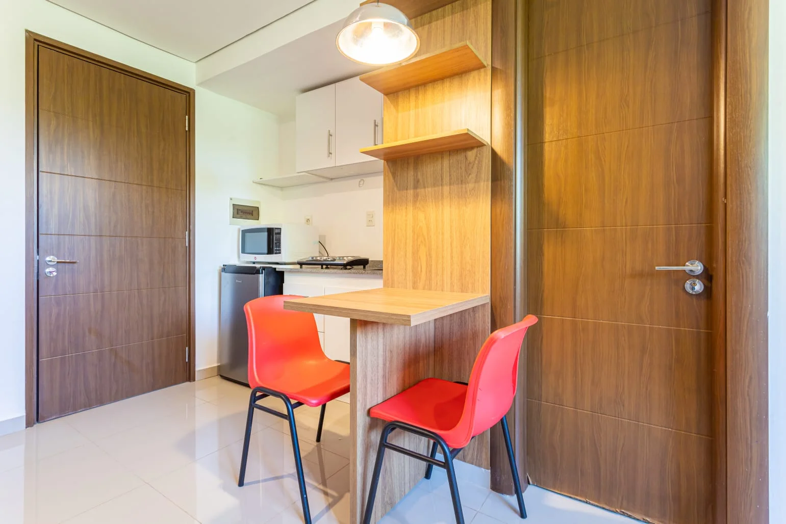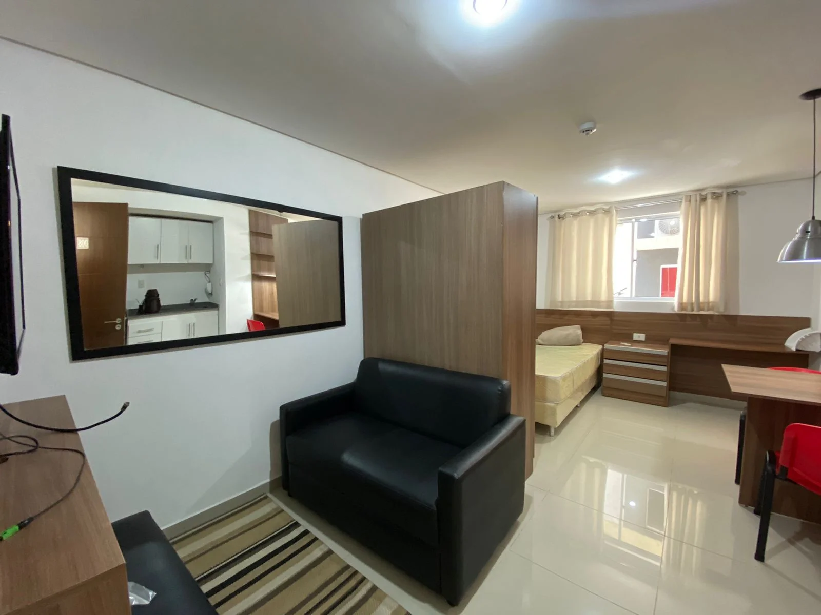 Departamento cuenta con A.A. split, cama somier, placard, escritorio con silla, baño con ducha eléctrica, kitchenette, Heladera, Microondas, Placa eléctrica.