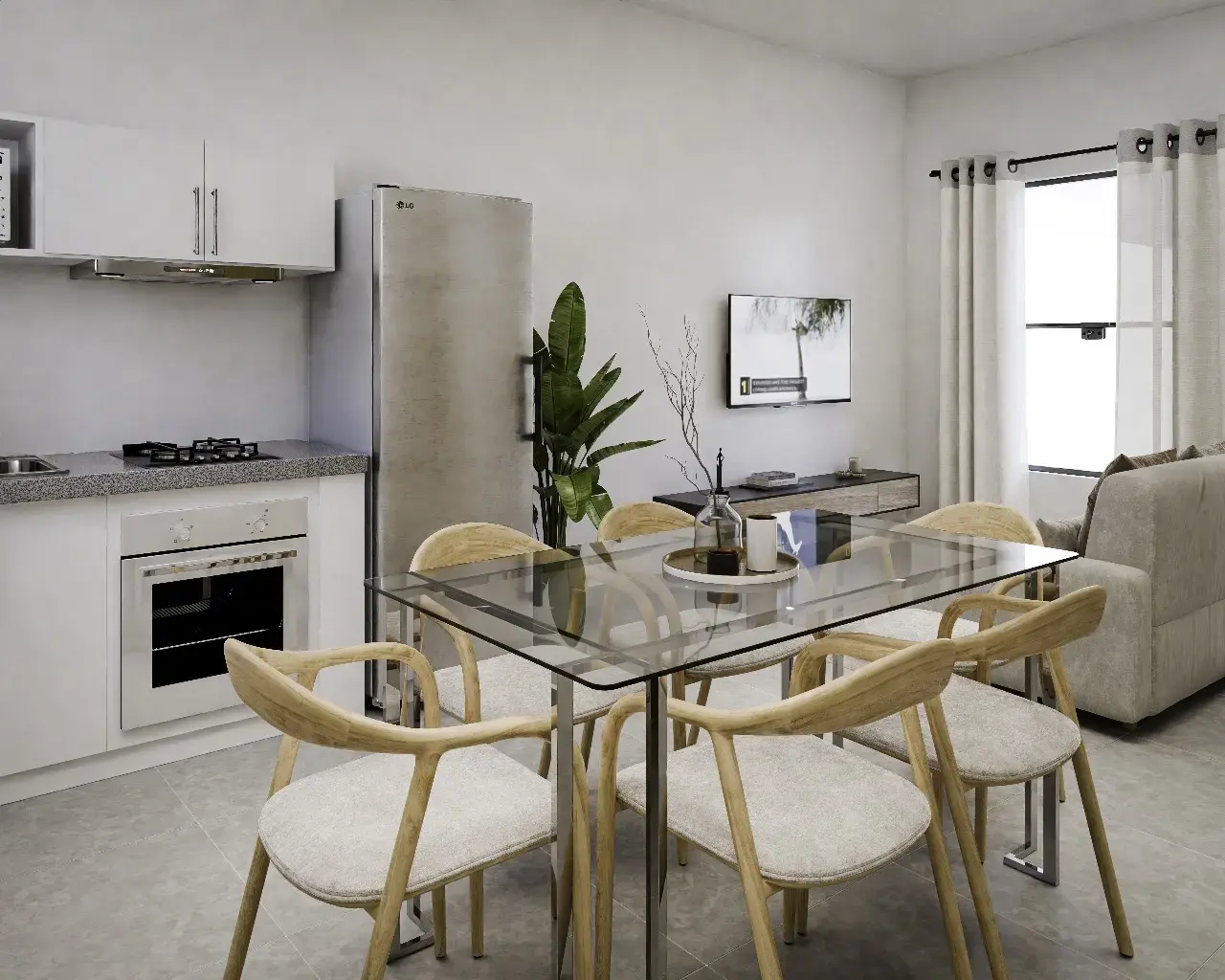 Sala, comedor y cocina integrados.