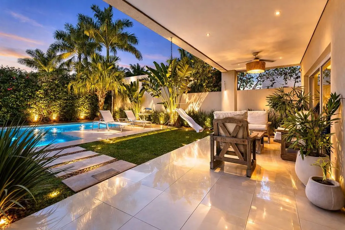 piscina y jardín.