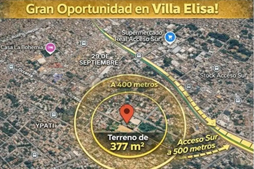 Descubrí una oportunidad sólida para invertir o construir en una de las zonas residenciales con mayor proyección de Villa Elisa. Este terreno de 377 m², con frente de 13,49 metros y fondo de 28 m2, se encuentra en un entorno urbano consolidado, con excelente conectividad hacia Acceso Sur y rápida salida a Asunción.