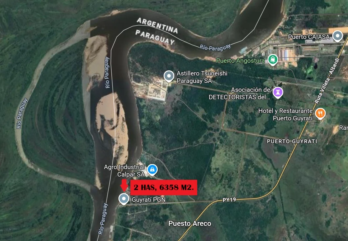 102,32 metros de costa sobre el Río Paraguay, con 7 KM del Puerto de Villeta, 2 Km río abajo de Ita Piru, esta propiedad tiene la ventaja de estar antes del cruce de Ita Piru, considerando que este cruce es conocido por la dificultad de pase en épocas de estiaje.