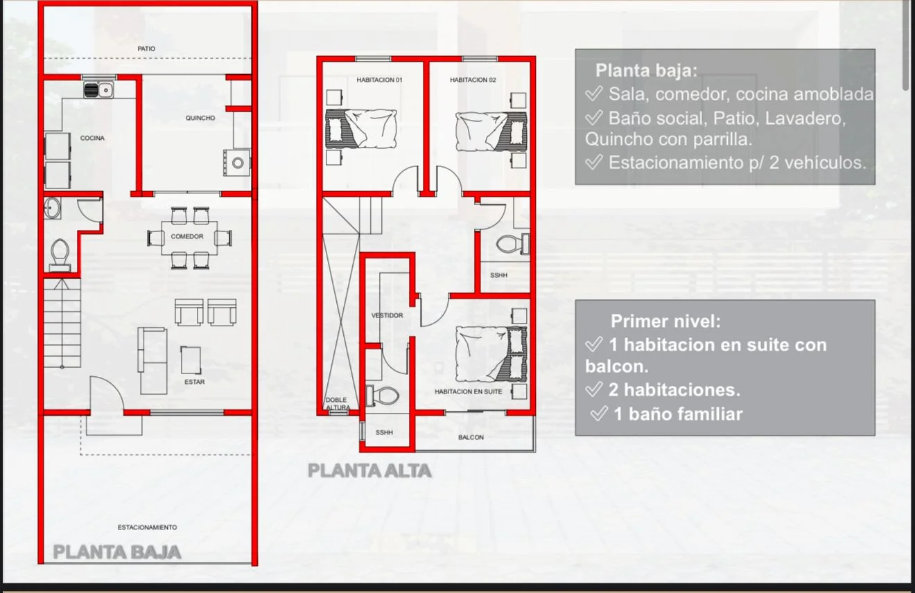 ✨ Planta Baja: sala-comedor, cocina moderna amoblada, baño social, patio, lavadero, quincho con parrilla y estacionamiento para 2 vehículos.