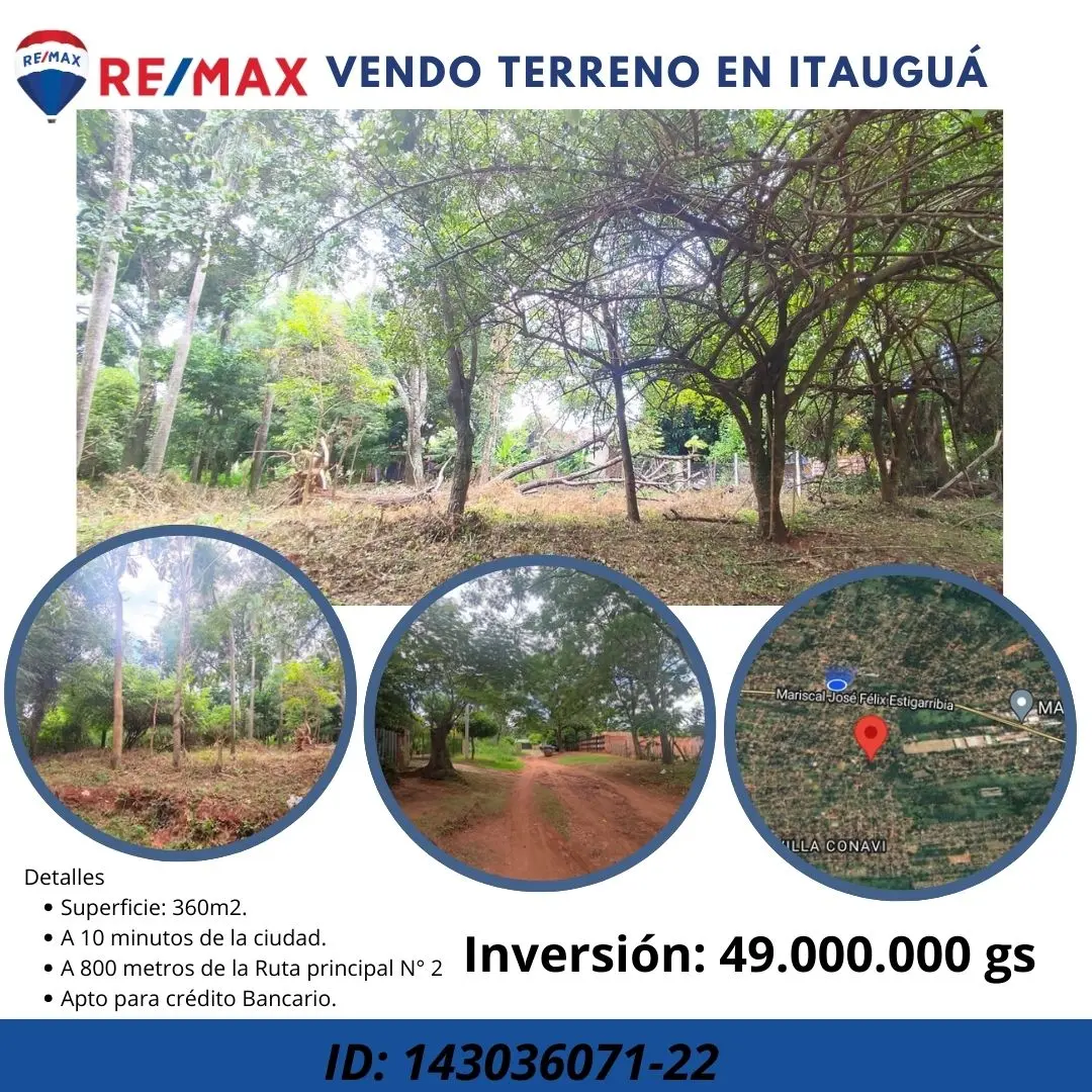 Terreno ubicado en La Ciudad de Itauguá a 10 minutos del centro de la ciudad, a 800 mts de la ruta principal N2, zona totalmente poblada a metros de la capilla San Juan.
